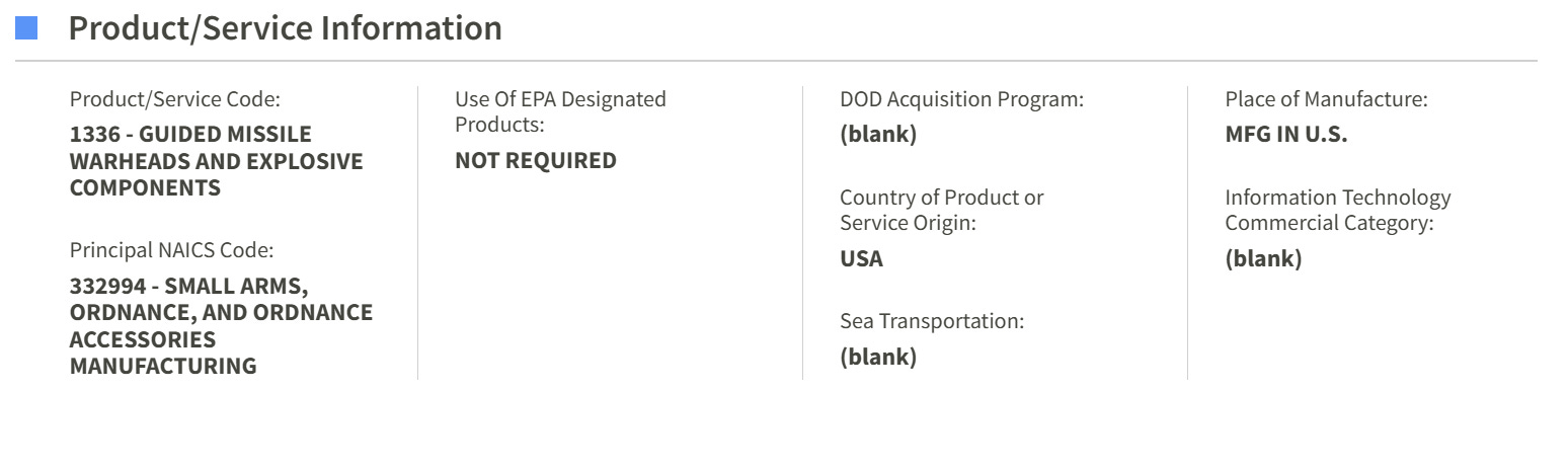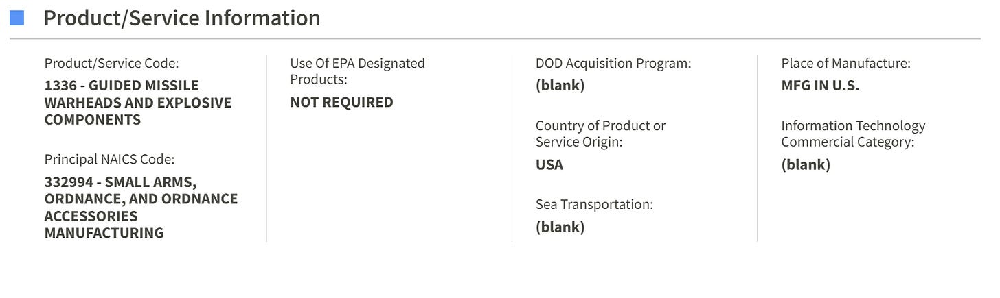 The language “guided missile warheads and explosive components” comes from one of two classification code systems the federal government and other large organizations use to lump purchases into identifiable buckets. In this case that language is Product and Service Code 1336.
